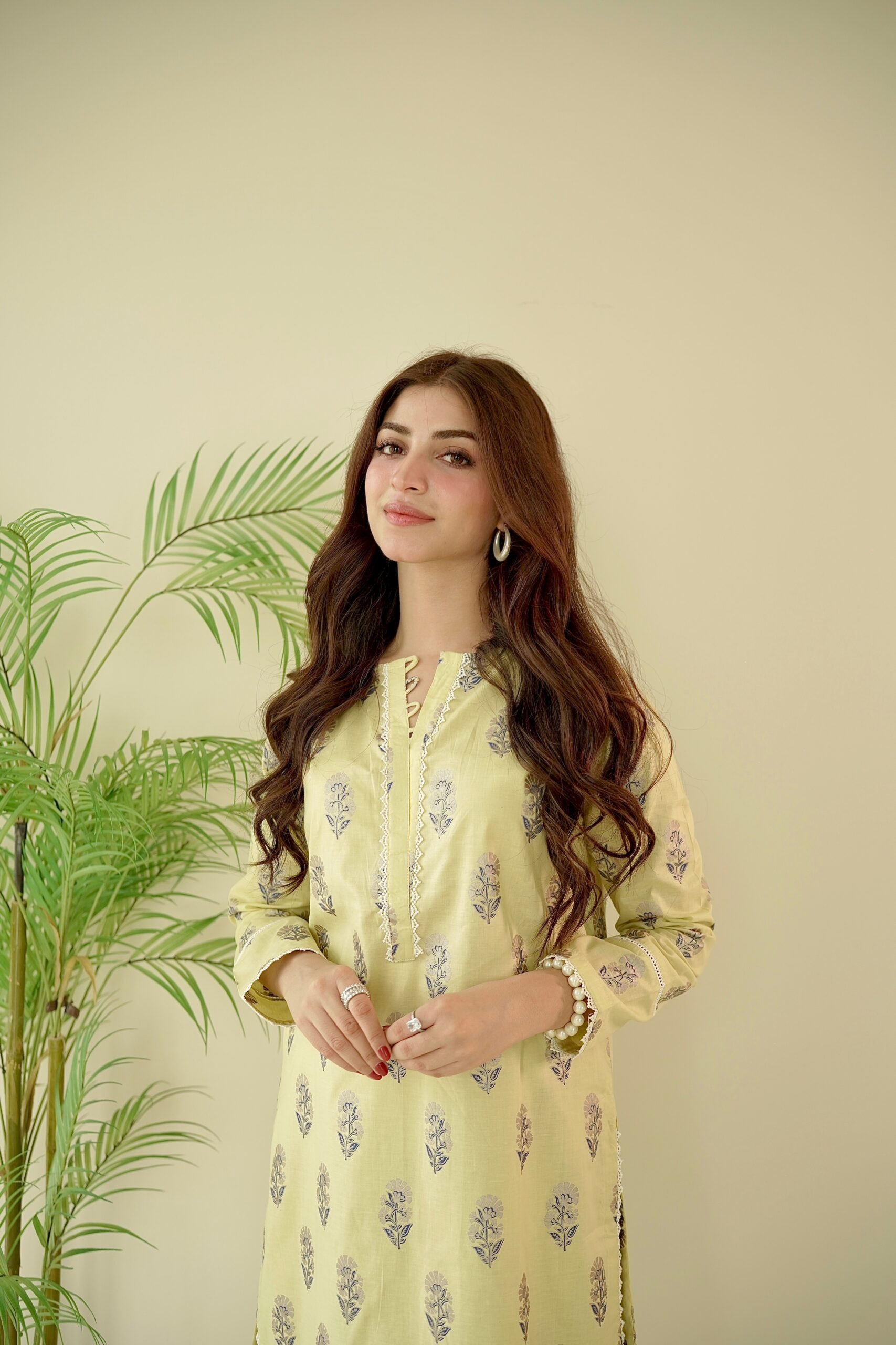 Introducing our Pastel Yellow 2 PC Trouser and Kameez Set, designed to brighten your summer wardrobe. Crafted from soft, breathable cotton fabric, this ensemble promises comfort, style, and versatility for the season.